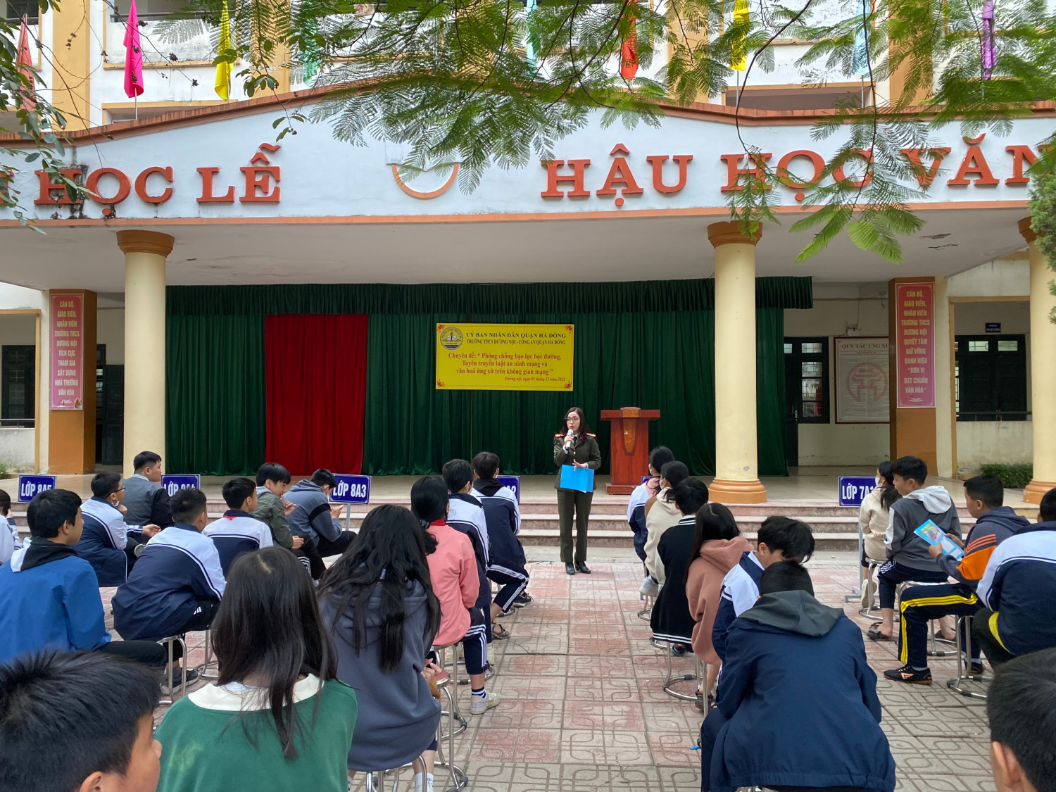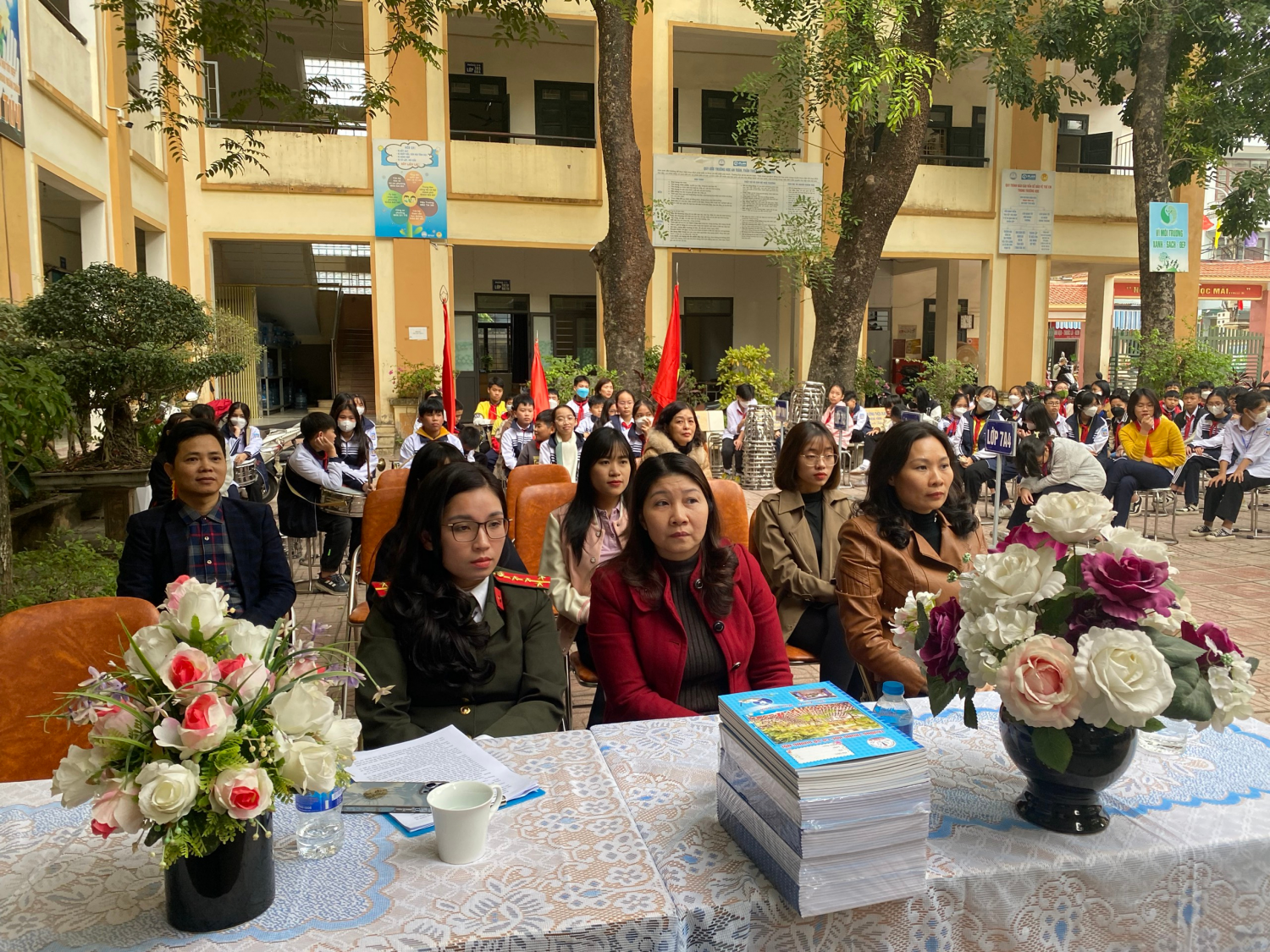 Tới dự buổi tuyên truyền phòng chống bạo lực học đường có sự tham dự các vị đại biểu đó là Đại uý Mầu Thái Nguyên - Đội hình sự Công an quận Hà Đông; Đại uý Mai Thị Tường Linh - Đội an ninh công an quận ;Về phía nhà trường có sự hiện diện của các thầy cô trong BGH nhà trường có cô giáo Trần Thị Kim Oanh - Bí thư chi bộ, hiệu trưởng nhà trường cùng toàn thể các thầy cô giáo trong Ban giám hiệu nhà trường và giáo viên chủ nhiệm cùng toàn thể học sinh của nhà trường tham dự đông đủ