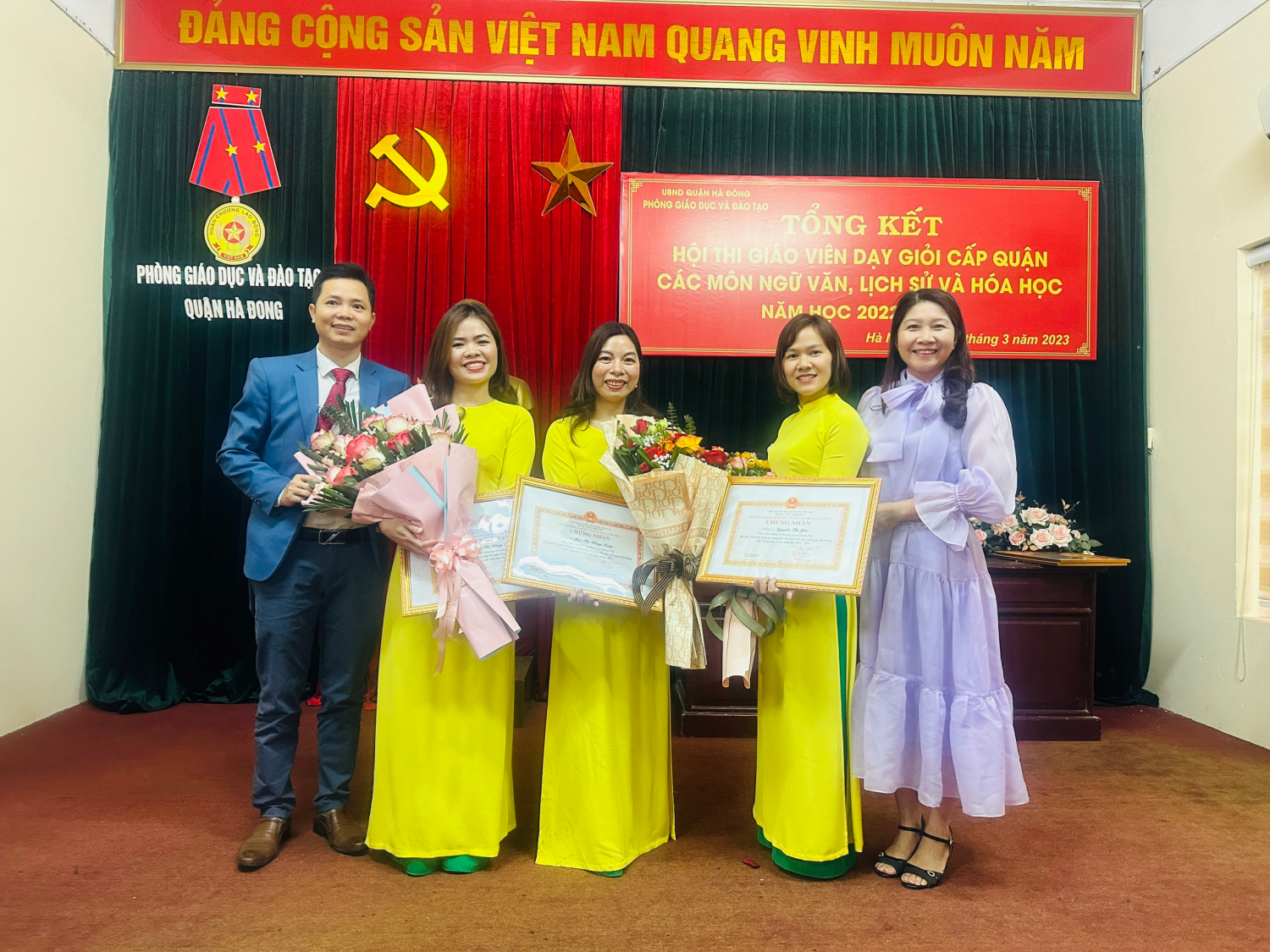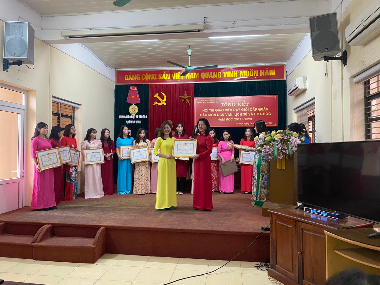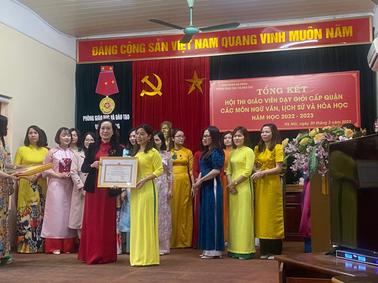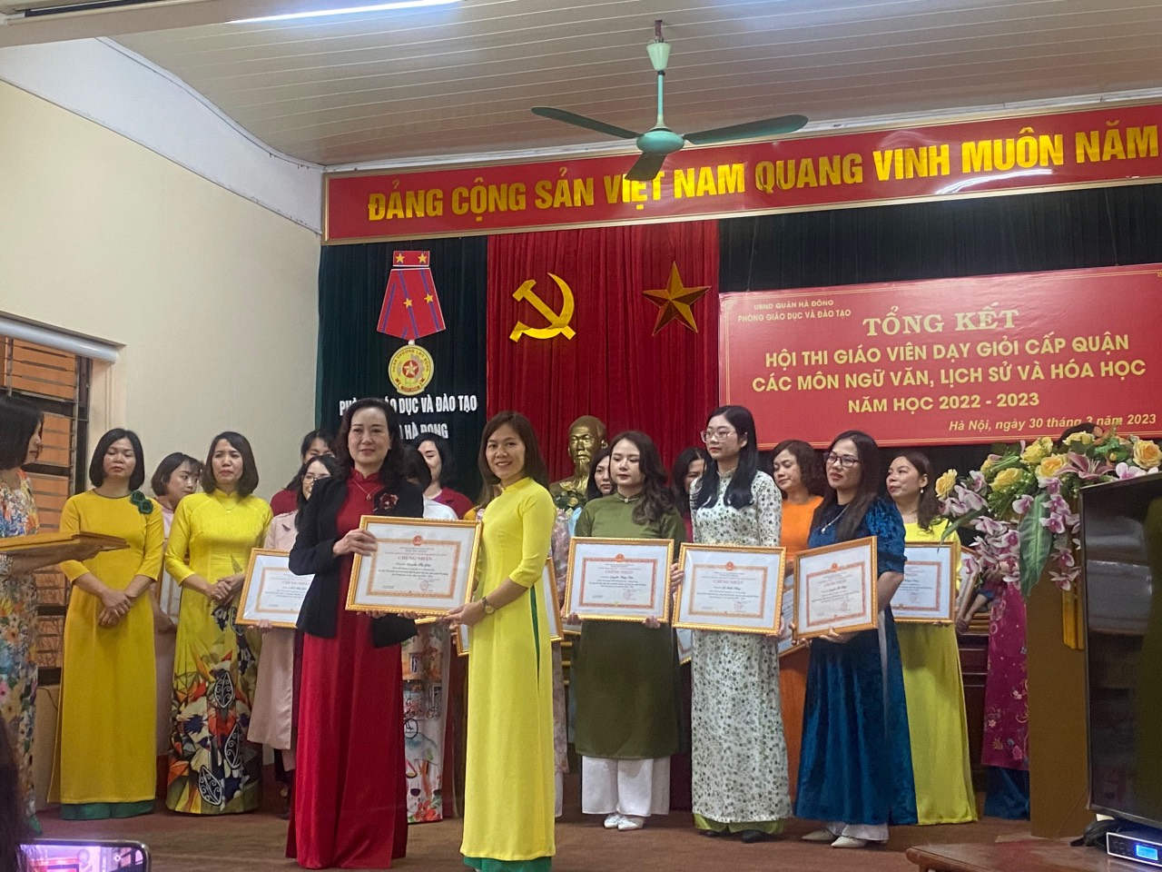 Sáng ngày 30 tháng 3 năm 2022, Phòng Giáo dục Đào tạo Hà Đông tổ chức Hội nghị Tổng kết Hội thi giáo viên giỏi cấp quận các môn Ngữ văn, Lịch sử, Hoá học cấp THCS năm học 2022 – 2023. Tham dự và chỉ đạo hội nghị có Nhà giáo, Tiến sĩ Phạm Thị Lệ Hằng – Quận uỷ viên, Trưởng phòng Giáo dục Đào tạo quận; Nhà giáo Nguyễn Thị Thu Hương - Phó trưởng phòng Giáo dục Đào tạo cùng các đồng chí chuyên viên phòng Giáo dục quận cùng các đồng chí trong Ban giám hiệu và 54 giáo viên của các đơn vị trường trong toàn quận cũng về dự đông đủ.