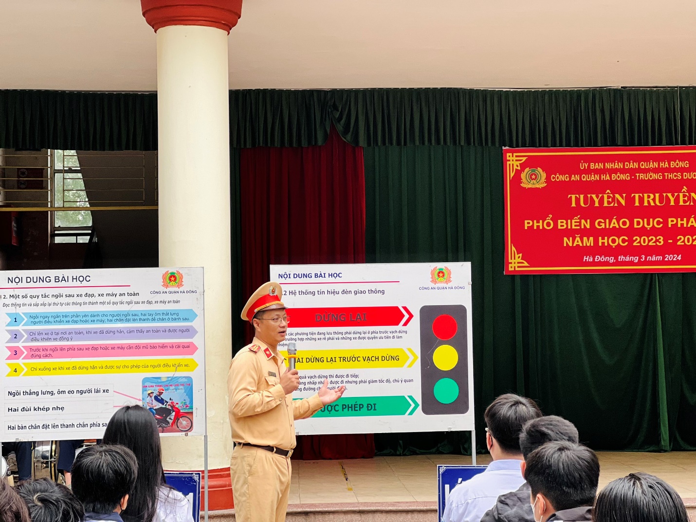 Đẩy mạnh tuyên truyền để tăng cường ý thức về an toàn giao thông , vào ngày 25/03/2024 – Trung tá Trần Thanh Quyết Đội cảnh sát giao thông trật tự quận Hà Đông đã thực hiện tuyên truyền về giáo dục An toàn giao thông cho toàn thể các em học sinh tại trường THCS Dương Nội.