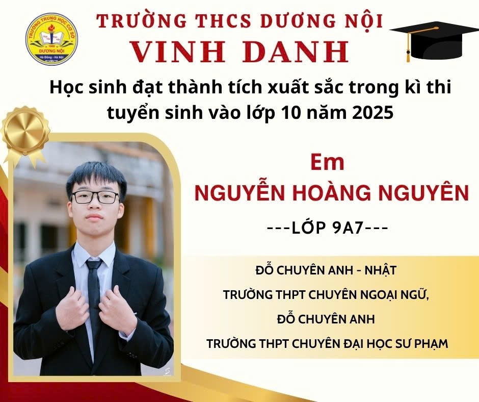 - Em Nguyễn Hoàng Nguyên - học sinh lớp 9A7 đã đỗ chuyên Anh của trường THPT Chuyên Đại học Sư phạm và trường THPT Chuyên Đại học Ngoại ngữ.