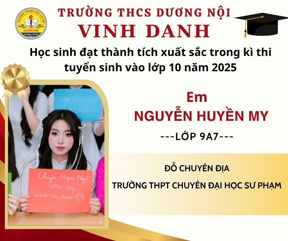 - Em Nguyễn Huyền My - học sinh lớp 9A7 đỗ chuyên Địa của trường THPT Chuyên Đại học Sư phạm.