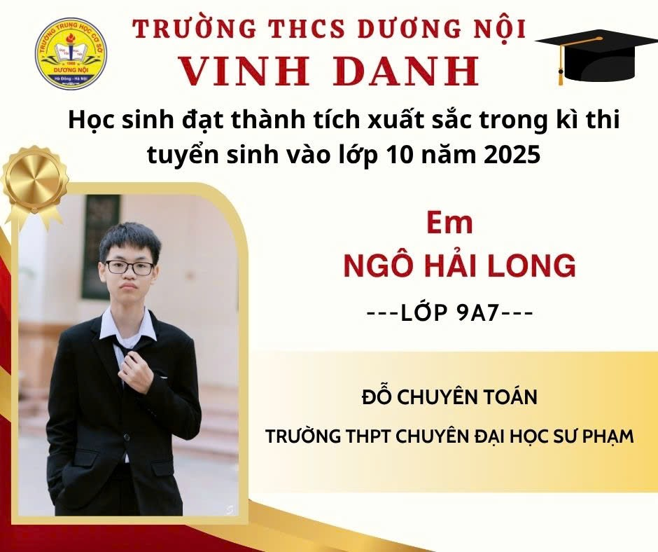 Trong kỳ thi tuyển sinh vào lớp 10 năm học 2024–2025, Trường THCS Dương Nội vinh dự ghi nhận thành tích nổi bật của nhiều học sinh, đặc biệt là những em đã xuất sắc đỗ vào các trường THPT chuyên danh tiếng trên địa bàn thành phố Hà Nội và cả nước.