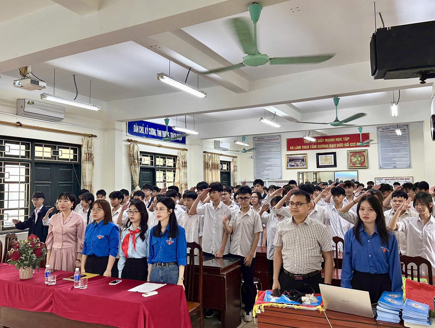 Mở đầu buổi lễ là nghi thức chào cờ trang nghiêm và đầy tự hào. Trong không gian lắng đọng, toàn thể đại biểu, thầy cô và học sinh cùng hướng về lá cờ Tổ quốc, cất cao Quốc ca, Đoàn ca với niềm xúc động và tinh thần trách nhiệm. Nghi thức chào cờ không chỉ tạo nên không khí thiêng liêng cho buổi lễ mà còn góp phần khơi dậy lòng yêu nước, niềm tự hào dân tộc và ý thức phấn đấu của mỗi học sinh khi được đứng vào hàng ngũ của Đoàn.