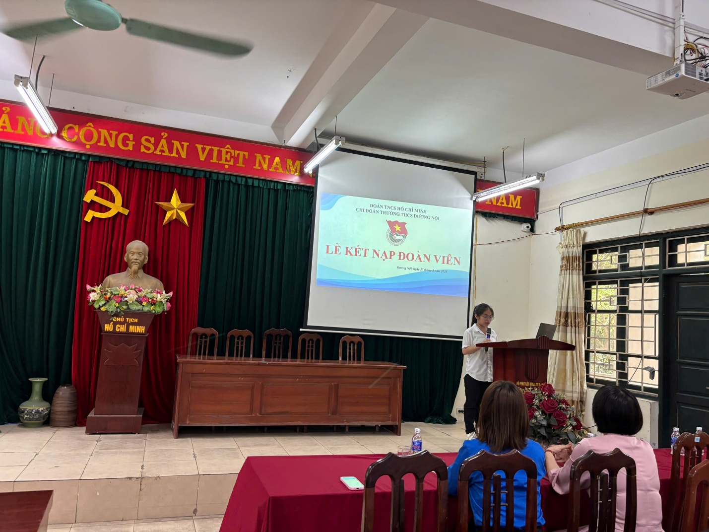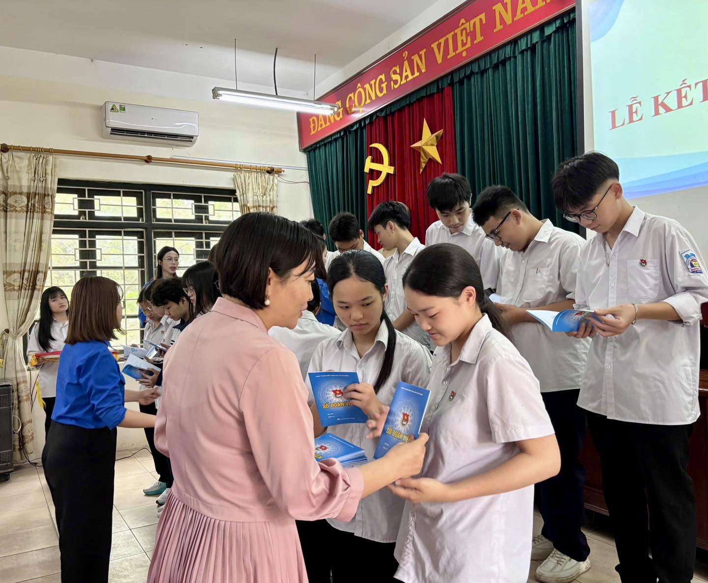 Tiếp đó, đại diện Chi đoàn nhà trường đã công bố quyết định kết nạp Đoàn viên mới và trao huy hiệu cùng sổ Đoàn cho các thanh niên ưu tú. Từng em học sinh được xướng tên, trang trọng nhận huy hiệu trên ngực áo và cuốn sổ Đoàn trên tay – dấu mốc ý nghĩa ghi nhận sự nỗ lực trong học tập và rèn luyện. Được đứng trong hàng ngũ của Đoàn TNCS Hồ Chí Minh là niềm tự hào, đồng thời cũng là trách nhiệm để các em tiếp tục phấn đấu, sống có lý tưởng và tích cực cống hiến.