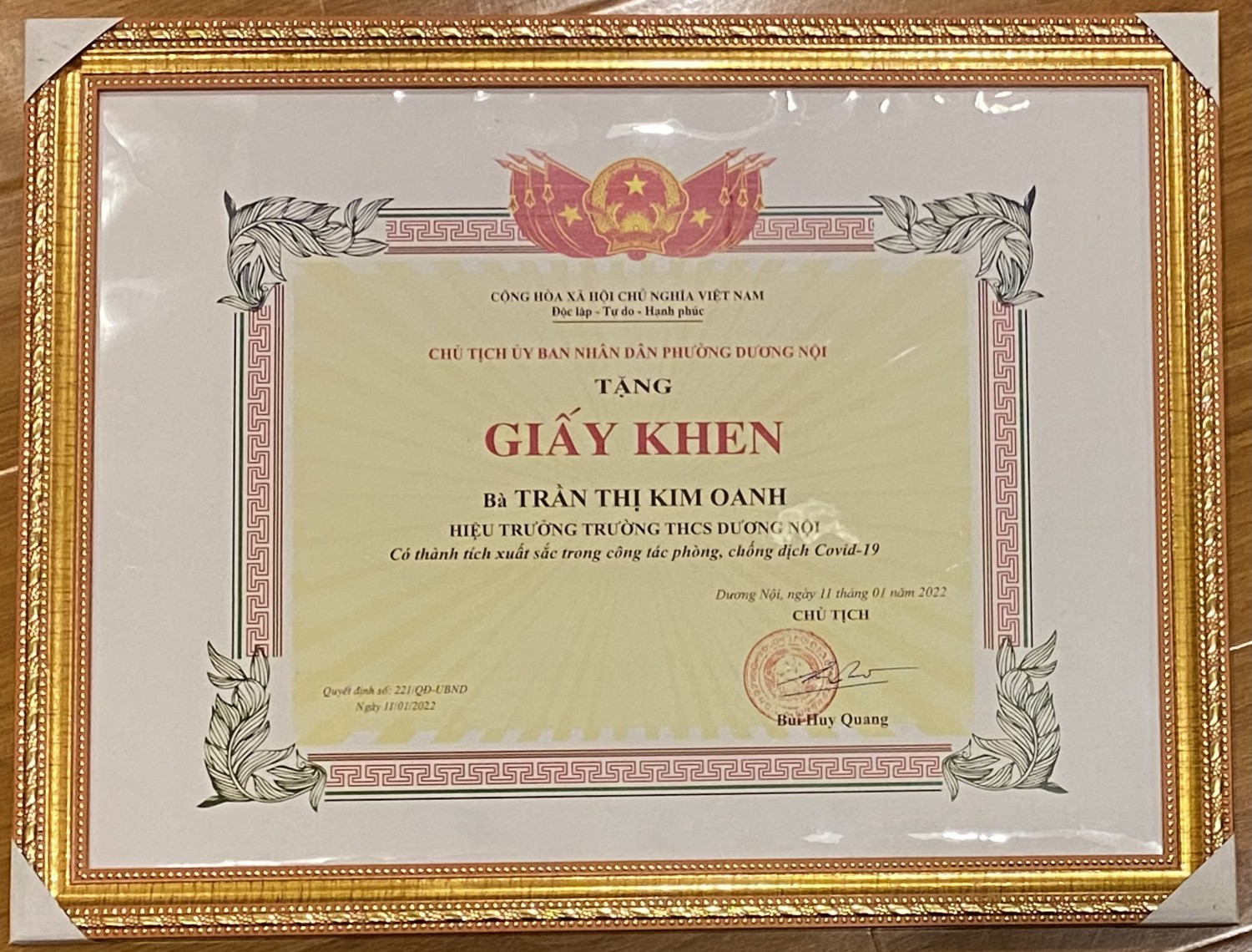 Ghi nhận những đóng góp công sức đó của tập thể Hội đồng sư phạm nhà trường. Chiều ngày 14 tháng 01 năm 2022, tại Hội nghị Tổng kết phong trào thi đua, khen thưởng công tác quân sự và phong trào “ Vì an ninh Tổ quốc” năm 2021, hội nghị tổng kết công tác xây dựng Đảng năm 2021. UBND phường Dương Nội cũng đã đánh giá cao hai đơn vị đó là THCS Dương Nội và trường mầm non Dương Nội làm tốt công tác phối hợp trong việc chăm lo sức khoẻ cho nhân dân trên địa bàn phường. Trong công tác phối hợp thực hiện nhiêm vụ trường THCS Dương Nội đã luôn tích cực hoàn thành tốt mọi nhiệm vụ địa phương giao cho, trong đó đặc biệt là sự đóng góp nhiệt tình và sáng tạo của đồng chí Trần Thị Kim Oanh - Hiệu trưởng nhà trường. Do đó tại Hội nghị, UBND phường đã tuyên dương khen thưởng tập thể nhà trường và đồng chí Trần Thị Kim Oanh có thành tích cao trong phong trào phòng chống Covid - 19.