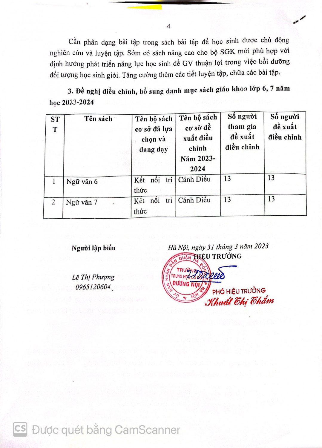 Trường THCS Dương Nội báo cáo công tác tổ chức đề xuất lựa chọn Sách giáo khoa lớp 8 chuẩn bị cho năm học 2023-2024.