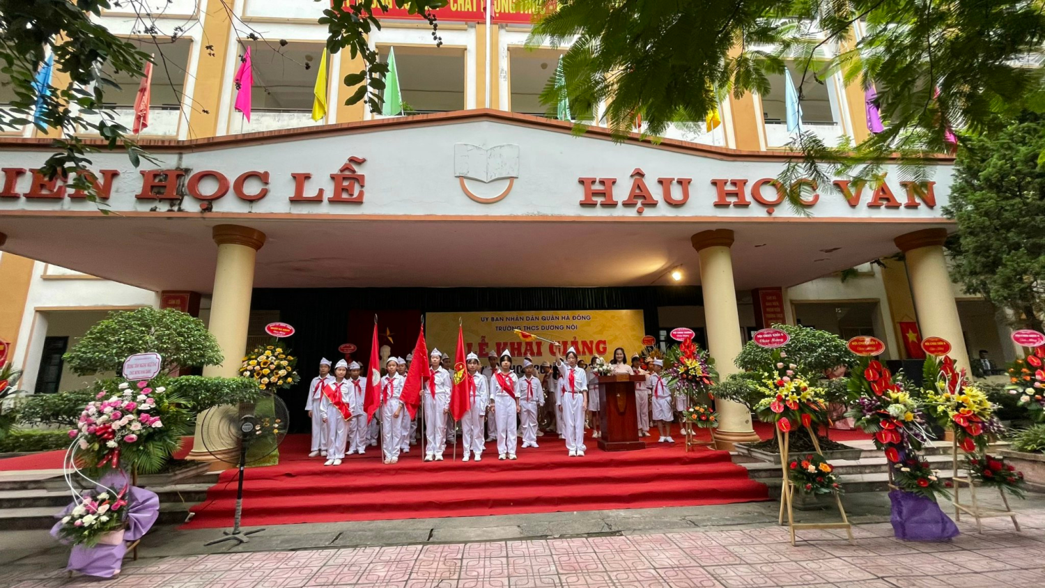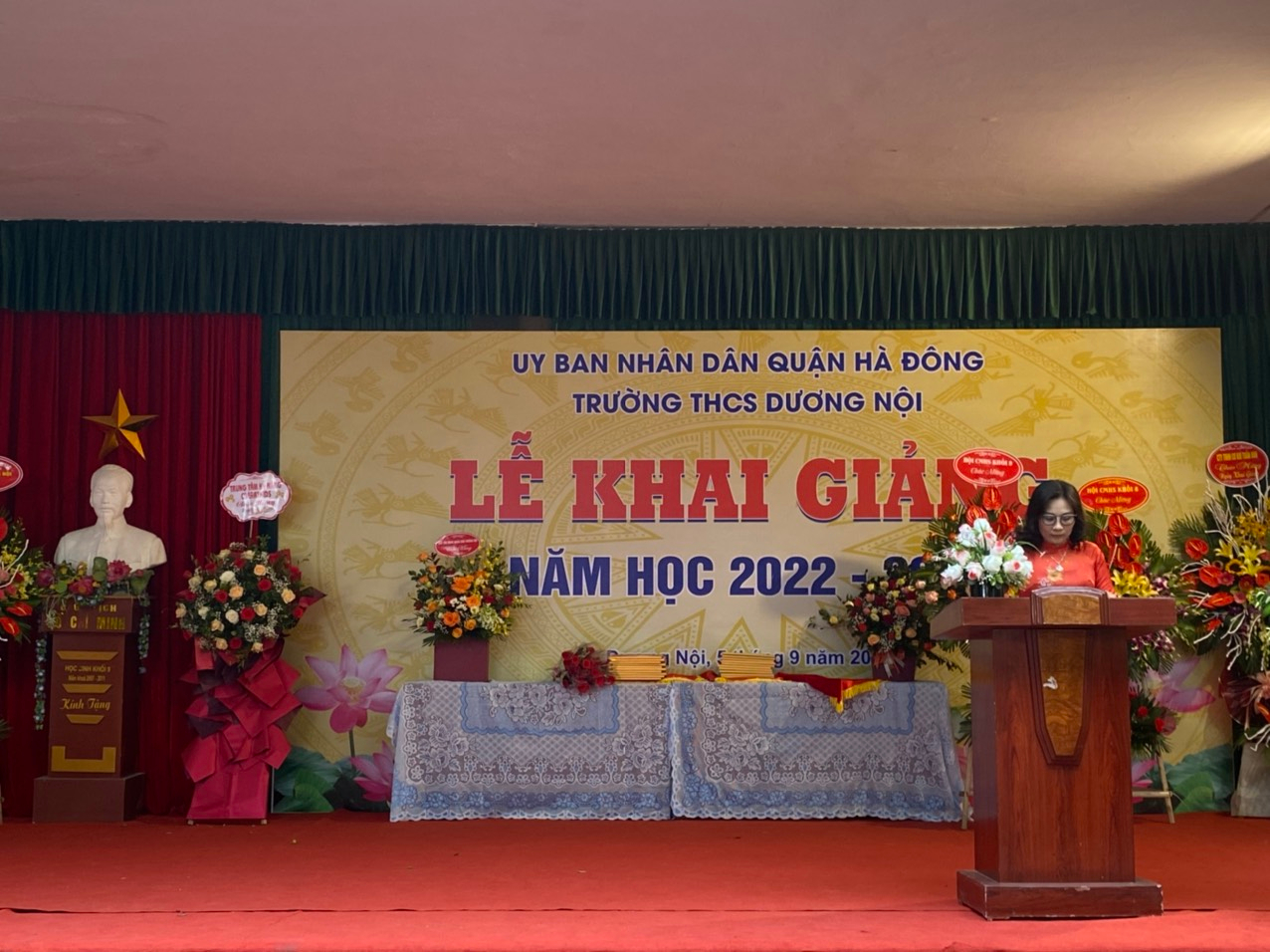 Hoà chung không khí tưng bừng của ngày hội “toàn dân đưa trẻ tới trường” hàng triệu Giáo viên, Học sinh, Sinh viên trên cả nước lại cùng nhau bước vào cuộc hành trình khám phá tri thức mới. Thực hiện sự chỉ đạo của phòng GDĐT quận Hà Đông, được sự nhất trí của các cấp, các ngành, sáng ngày 5/9/2022 trường THCS Dương Nội long trọng tổ chức Lễ khai giảng năm học mới, năm học 2022-2023. Rất vinh dự và tự hào thầy, trò nhà trường được đón tiếp đại biểu đại diện Quận uỷ, UBND, HĐND cấp quận có ông Phạm Văn Chiến - Phó Chủ tịch Uỷ ban nhân dân quận; Đại biểu đại diện cho Phòng Giáo dục quận có Bà Nguyễn Thị Hổng Phương - Chuyên viên Phòng Giáo dục và đào tạo quận; Đại diện cho Đảng uỷ, UBNB, HĐND có ông Nguyễn Bá Khánh- Phó chủ tịch UBND phường; Ông Dương Ngọc Cúc- Chủ tịch HĐ quản trị Quỹ tín dụng nhân dân Dương Nội; Đại diện các cơ quan, công ty, doanh nghiệp các tổ chức đóng trên địa bàn phường cùng đại diện Hội cha mẹ học sinh toàn trường và Trưởng ban Hội cha mẹ học sinh 41 lớp cùng 81 Cán bộ giáo viên, nhân viên và 1806 học sinh của nhà trường