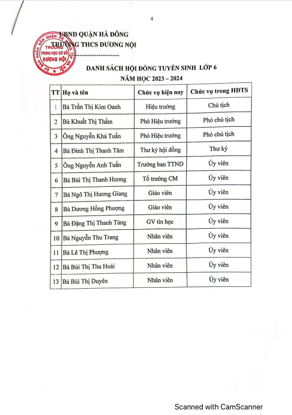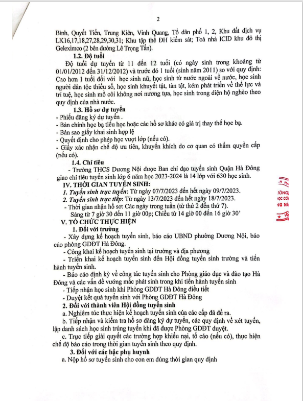 Trường THCS Dương Nội được Ban chỉ đạo tuyển sinh Quận Hà Đông giao chỉ tiêu tuyển sinh lớp 6 năm học 2023-2024 là 14 lớp với 630 học sinh.