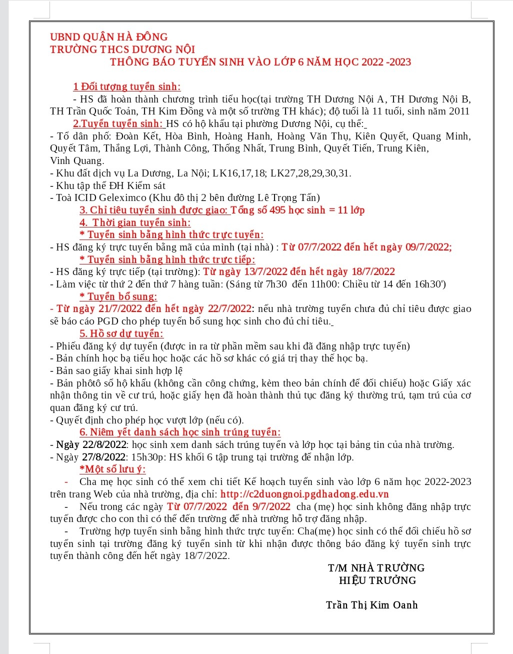 Thông báo tuyển sinh lớp 6 năm học 2022-2023